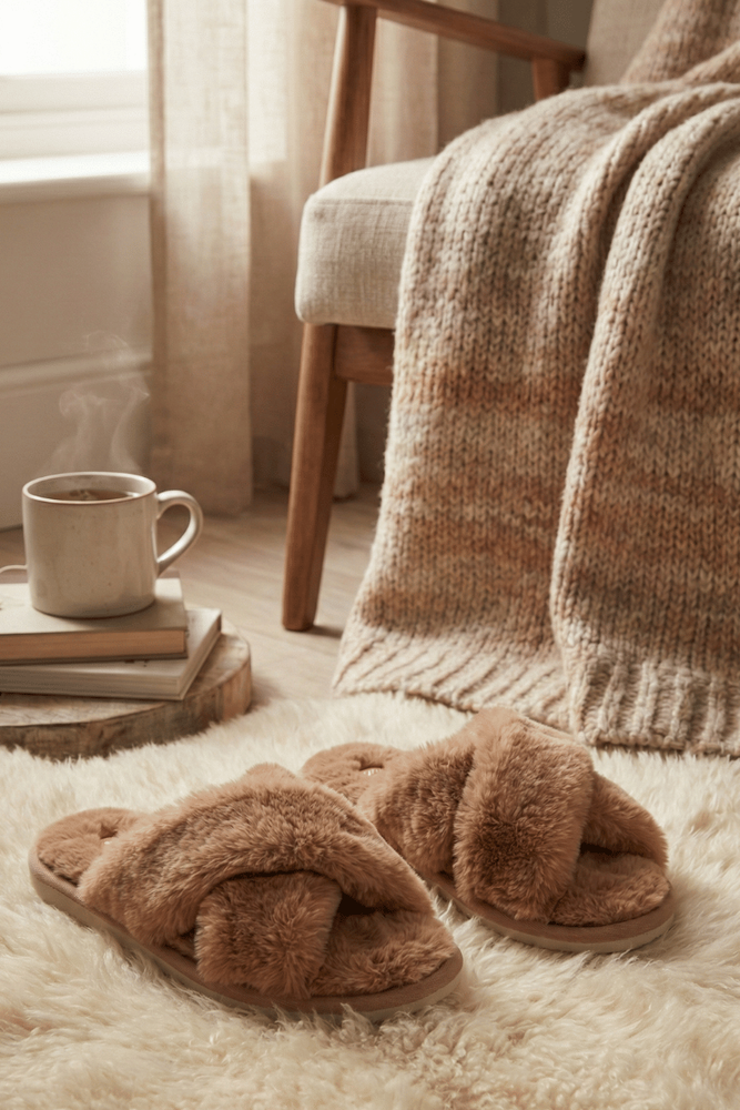 Ciepłe kapcie damskie futerkowe na krzyż w kolorze camel