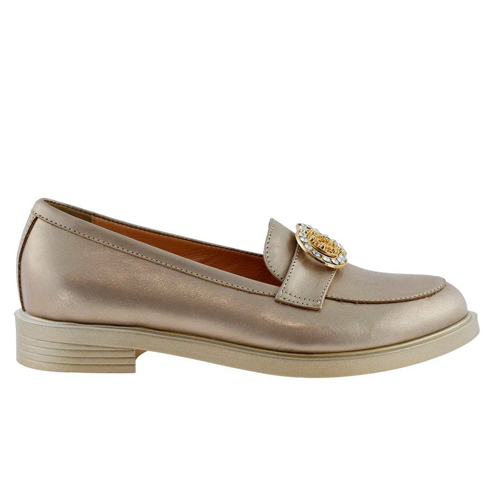 Beżowe skórzane mokasyny z metalową broszką Arka