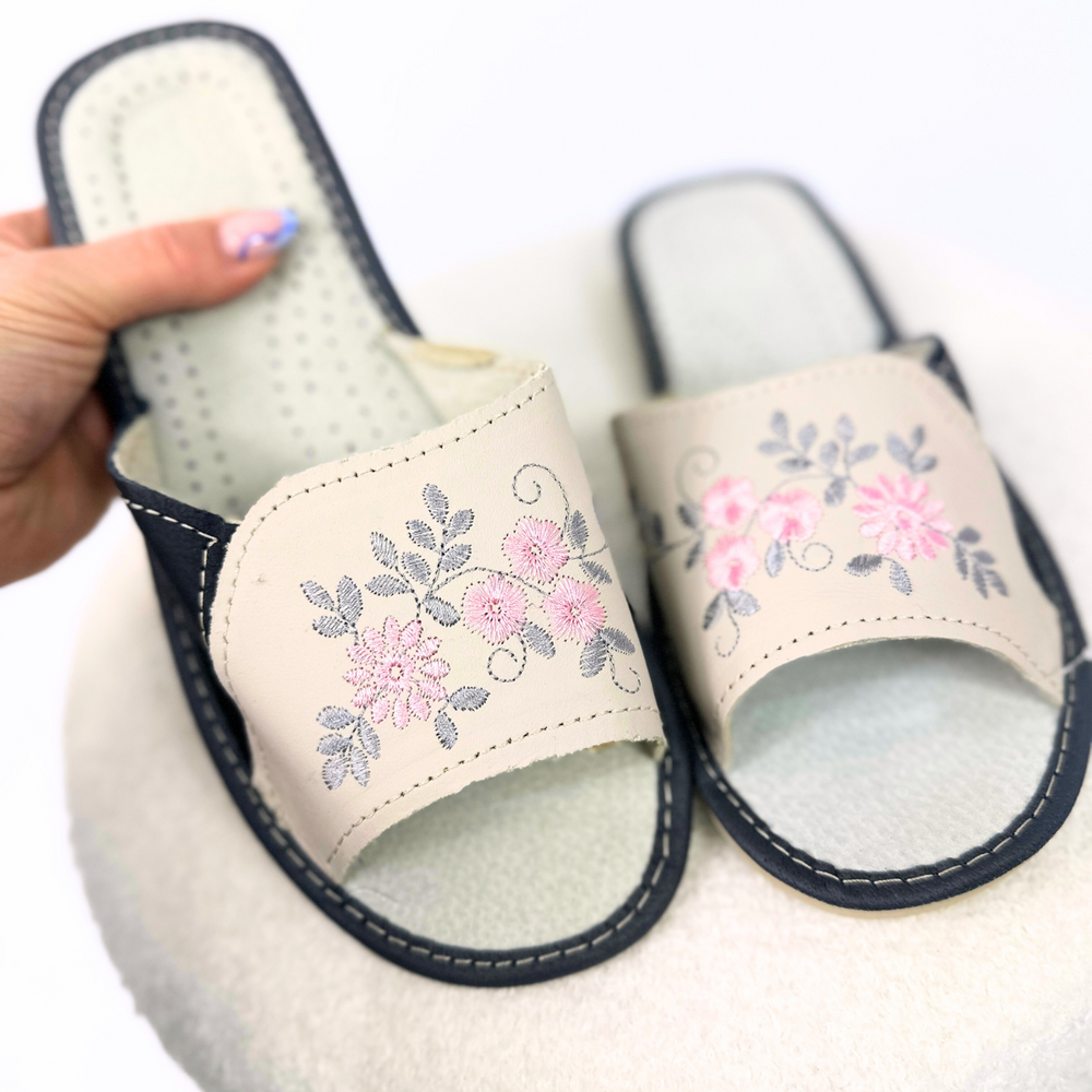 Klapki skórzane domowe z haftem w kwiatki