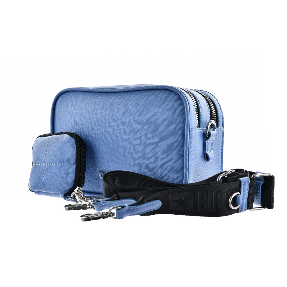 Mała damska torebka z ekoskóry w kolorze niebieskim. Z metalowym logo po środku o niewielkich rozmiarach jest w stanie pomieścić naprawdę wiele. Wpiszę się w każdą stylizację. Posiada doczepianą niebieską saszetkę, którą można wykorzystać jako mini portfel lub schowek na klucze. Dzięki szerokiemu pasku jest wygodna w noszeniu można go regulować według swoich potrzeb od 69-114 cm