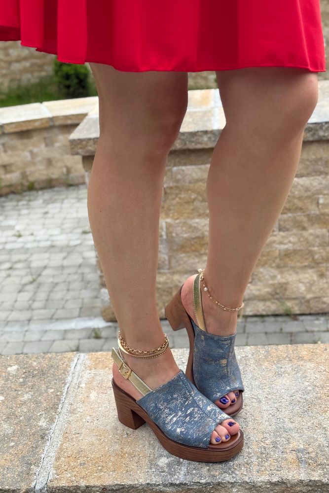 Jeśli kochasz modę i wygodę, te jeansowe sandały z pozłacanym wykończeniem i drewnianym słupkiem to must-have tego sezonu! Wyróżnij się i czuj się pewnie przy każdym kroku.