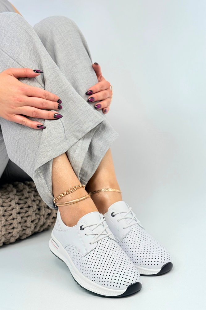 Oferowane przez nas sneakersy Filippo na komfortowej podeszwie w postaci koturna to doskonały wybór. Zostały one wykonane z najlepszej jakości skóry naturalnej, co sprawia, że są niezawodne. Z kolei komfort noszenia sneakersy Filippo zapewnia skórzana wkładka. Ponadto ażurowy wzór przyciąga wzrok. Model ten sprawdzi się w wielu codziennych stylizacjach (zarówno do spodni, jak i sukienki). Dodatkowo dzięki sznurowaniu można je dopasować do stopy.