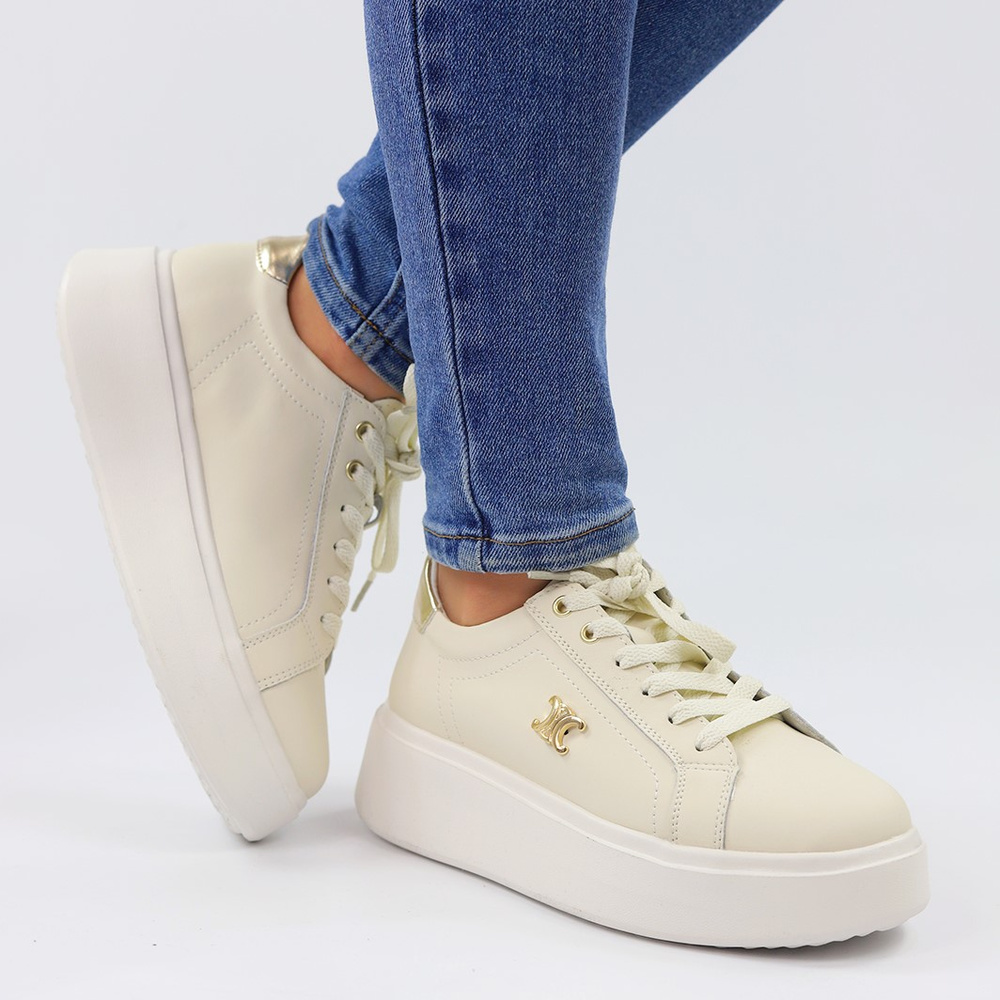 Skórzane beżowe sneakersy ze złotymi wstawkami na platformie Potocki